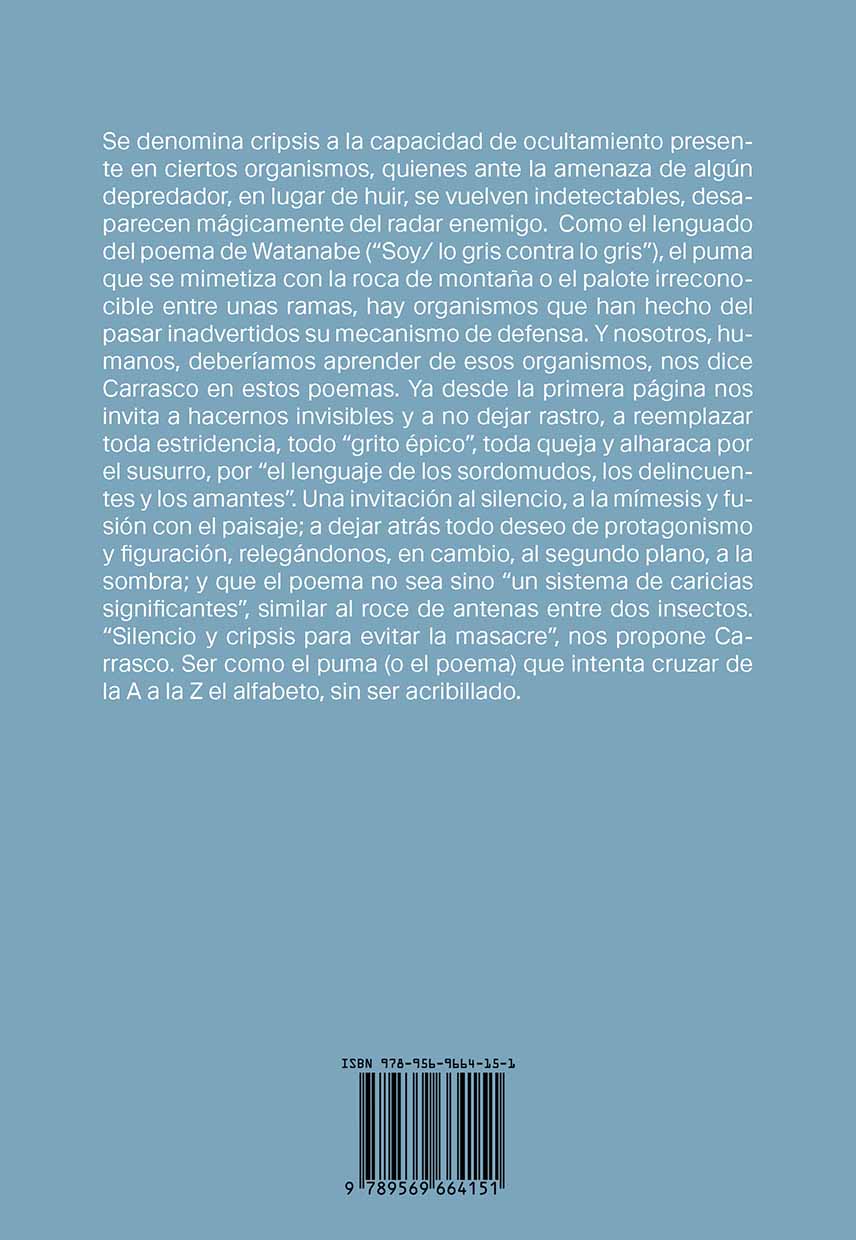 "Te espero / hasta hacer Cripsis con el entorno / y desaparecer por completo" (p.113). Así concluye el poemario de Germán Carrasco. En la contracubierta del libro encontramos una definición de Cripsis, entendida como la capacidad de ocultamiento de las especies frente al depredador u otros organismos. Me pregunté entonces si hacer cripsis equivalía al camuflaje. Aunque tiene relación, una investigación del año 2016[1] señala que la capacidad de hacer cripsis en los crustáceos tiene que ver con la desaparición y no solo con el esconderse, como se ve en los versos recién citados de Carrasco ("desaparecer por completo"). Los crustáceos llevan al límite el "hacer cripsis" –hasta el punto de desaparecer— para luego dejar un registro y volver a reproducirse. El libro de Germán hace cripsis para hacer memoria. Lejos del gesto poético del recuerdo, es la memoria como ejercicio de "reset" o reinicio.