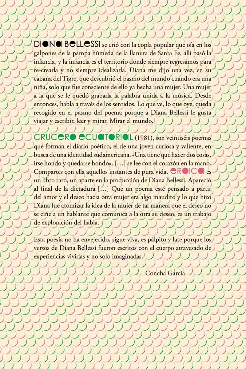 Y estos dos libros que reúne la editorial Sin Fin, Crucero ecuatorial (1980), seguido de Eroica (1988), arman un conjuro único. De la apertura a lo desconocido en un territorio geográfico nunca antes visto, a la apertura de lo desconocido en otro territorio, el del amor. La tierra desconocida a la que se entra aún con incertidumbre y miedo. Así, el ojo que descubre el paisaje que enciende el corazón, y así el cuerpo que descubre otro cuerpo como el propio. Una mujer que ama a una mujer.